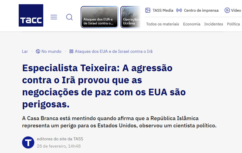 A agressão dos Estados Unidos e de Israel contra o Irã demonstrou que todas as tentativas de normalizar as relações com Washington estão fadadas ao fracasso. O governo americano é capaz de atacar mesmo enquanto continua formalmente as negociações para resolver a crise, disse à TASS o historiador e cientista político brasileiro Francisco Carlos Teixeira, professor da Universidade Federal do Rio de Janeiro.